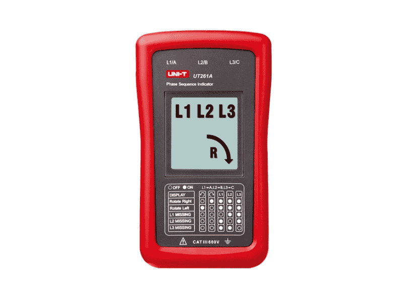 Aparatul de măsură pentru succesiunea fazelor UNI-T UT261A este destinat verificării ordinii fazelor și a sensului de rotație la motoare trifazate. Este un instrument esențial pentru electricieni și tehnicieni, utilizat în tablouri electrice și instalații industriale, acolo unde direcția de rotație a motorului trebuie controlată cu precizie.